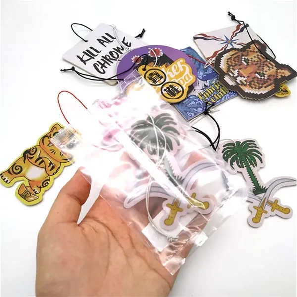 Literally a refreshing way to promote your brand. These2-sided full color air fresheners eliminate unpleasant odors wherever someone hangs them. Not just limited to cars, offer these air fresheners in camps, gyms, dorms, locker rooms, garages and more. Available in 15 stock shapes and 7 pleasing fragrances. Want to make a bold statement? Choose a completely custom shape at an additional cost. Elastic hanging loop included. Keep out of reach of animals and children. Avoid contact with eyes. Washing hands is recommended after handling.