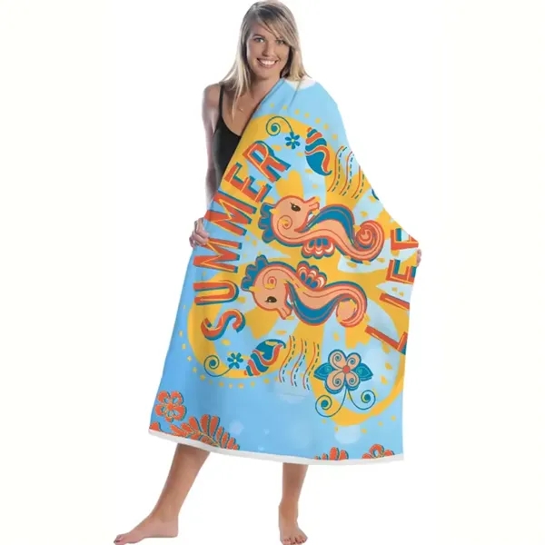 A very soft microfiber beach towel can be customized full color, full-size logo. Its edges are reinforced. It is highly absorbent and can quickly dry water on the surface of the body. Not only as a towel, it is also very suitable for laying on the beach as a cushion. Orders of 5,000 pieces or greater are eligible for sea shipping. Give us a call or email, we are happy to re-quote and answer questions for you.